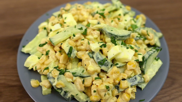 Krastavac isecite na kolutove, pa kolutove prepolovite. Kuvana jaja isecite na kockice. Stavite u činiju, dodajte izgnječen beli luk, kukuruz, so, biber, pavlaku i promešajte. Salata je spremna. Po želji možete je ohladiti pre jela.