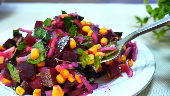 Salata sa cveklom i kukuruzom je lagani letnji obrok, ali kako je leto na izmaku možete da je služite i kao prilog. Kada su napolju visoke temeprature više nam prija osvežavajuća hrana, poput ove salate, ali kada zahladni ovako ukusna salata je super uz pečenje ili neko meso po izboru. Takođe, zbog raznovrsnih boja ulepšaće svaku slavsku ili prazničnu trpezu.