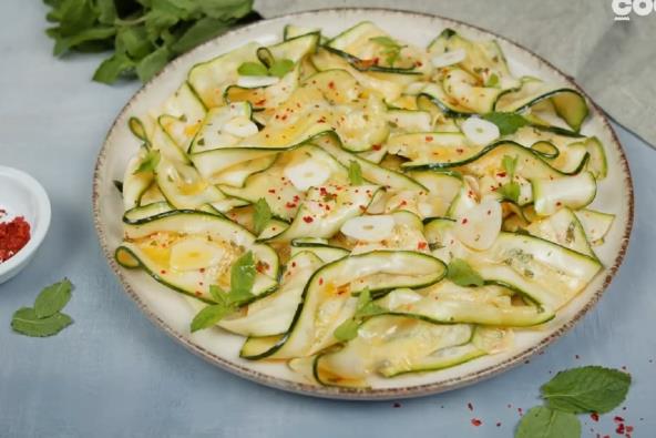 Tikvice dobro operite, pa ih isecite na tanke trake zajedno sa korom. Ređajte kriške tikvica u cediljku jednu na drugu, posipajući solju između slojeva. Ostavite tikvice da odstoje tako oko sat vremena, da puste višak vode. U međuvremenu, napravite jednostavan preliv tako što ćete pomešati seckanu mentu i naseckan beli luk, maslinovo ulje, sirće, so i ljutu papriku. Osušite kriške tikvica papirnim ubrusima. Položite jedan sloj tikvica u tepsiju i prelijte kašikom marinade. Ponavljate postupak dok ne potrošite sav materijal. Pokrijte tepsiju plastičnom folijom i ostavite da se sve marinira u frižideru 8 sati. Nakon toga salata je spremna za jelo, a po želji je ukrasite da nekoliko listića nane i dodajte još malo ljute papričice ili soli.