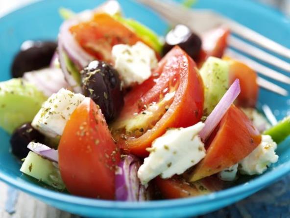 3. Iscedite feta sir i isecite na kockice. Podelite salatu u tanjire, dodajte svakoj porciji fetu i po želji ukrasite listovima origana.