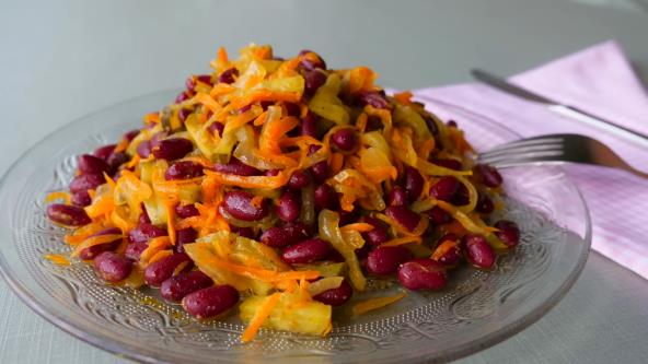 Šargarepu očistite i izrendajte na krupnije rende, a luk naseckajte na sitnije kockice. U tiganju zagrejte malo ulja, pa povrće kratko propržite da omekša. Povrće prebacite u cediljku i ostavite da se ocedi od viška ulja, ali sačuvajte tečnost u činiji. Za to vreme isecite krastavčiće što sitnije. U tečnost koja je ostala od povrća dodajte, biber, so, papriku, med i senf, pa sve dobro promešajte. Dinstano povrće, krastavčiće i pasulj pomešajte u činiji, pa sve prelijte dresingom koji ste napravili. Sve dobro promešajte, dodajte još začina ukoliko ima potrebe i salata je spremna za jelo.