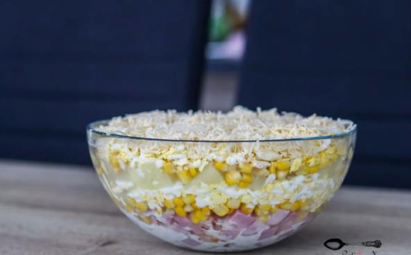 Salate u slojevima, posebno ako su šarene, se odlično uklapaju na svečanim trpezama. Ukoliko vam je dosadilo da stalno pravite rusku ili mimozu, evo jednog recepta za salatu sa šunkom, kuvanim jajima i kukuruzom. Dodatak ananasa će joj dati neku posebnu aromu, međutim, ukoliko ne volite da eksperimentišete sa ukusima nemojte ga stavljati.