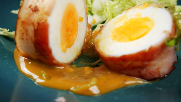 Jaja skuvajte i stavite u hladnu vodu. U posudi pomešajte senf, kečap, med, muskatni oraščić i limunov sok. Jajima skinite ljusku, obrišite ubrusom i umotajte u slaninu. Ispržite u tiganju bez ulja sa svih strana, pa stavite jaja u sos. Zatim u istom tiganju propržite seckani praziluk i pospite preko jaja.