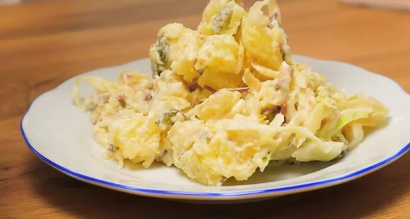 Krompir stavite da se kuva, možete malo posoliti vodu. Kupus isecite i stavite u činiju. U jednoj posudi pomešajte kašičicu soli, sirće, maslinovo ulje, biber. prelijte kupus i promešajte. Ostavite da odstoji 10 minuta. Seckan crni luk izdinstajte na maslinovom ulju. Dodajte i izgnječen beli luk. Izvadite luk u jednu posudu, a u istom tiganju izdinstajte seckane pečurke. Skuvan krompir iseckajte na kockice i stavite u činiju sa kupusom. Dodajte pečurke, luk, seckane krastavčiće. Promešajte. Na kraju dodajte senf i pavlaku, pa sve sjedinite.