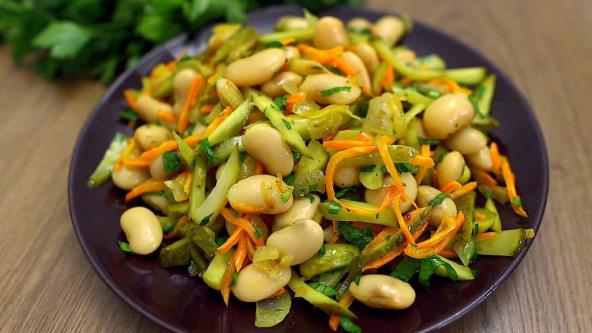 Na maslinovom ulju propržite sitno seckan luk i rendanu šargarepu. Prebacite u činiju pa dodajte seckane krastavčiće i pasulj iz konzerve. Ubacite svež peršun, posolite i pobiberite i prelijte maslinovim uljem. Dobro promešajte i servirajte.