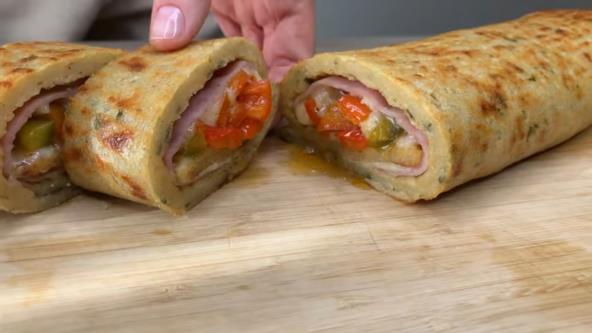 Izrendajte krompir, pa mu dodajte seckani peršun, vodu, so, biber i brašno. Dobro sjednite i sipajte u pleh obložen pek papirom koji ste malo nauljili. Lepo rasporedite i premažite uljem. Pecite u zagrejanoj rerni na 200°C oko 25 minuta. Iseckajte papriku, pa propžite sa celim čenom belog luka. Koru izvadite iz rerne, poređajte šunku, a preko pospite rendani sir. Zatim rasporedite i paprike (bez belog luka) i urolajte. Vratite u rernu na 180°C na još 7-8 minuta.