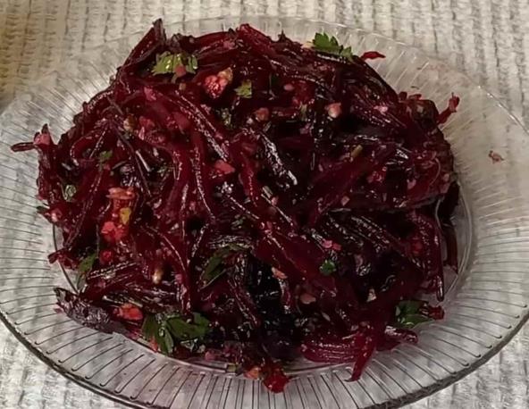Skuvajte cveklu, pa je izrendajte. Zatim u činiji pomešajte cveklu, seckani peršun, orahe, suve šljive i mleveni beli luk. Lepo promešajte, pa dodajte ulje, balzamiko, so i biber. Dobro promešajte i poslužite.