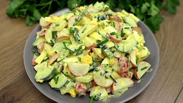 Jaja skuvajte, pa kada se prohlade isecite. Sipajte u posudu, pa dodajte seckani krastava, rotkvice, mladi luk i sve začinite po želji. Zatim dodajte majonez ili pavlaku i promešajte. Poslužite.