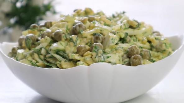 Isecite crni luk na rebarca, pa posolite i pošećerite, a onda sipajte sok od limuna i vodu. Dobro promešajte i ostavite da se marinira nekih sat vremena. Za to vremen obarite jaja i kada se ohlade izrendajte. Takođe izrendajte i tvrdi sir. U posudi pomešajte jaja, seckanu mirošiju, peršun, rendani sir, proceđeni grašak i luk. Dobro promešajte, pa posolite i pobiberite. Dodajte majonez i opet promešajte.