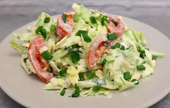 Izrendajte kupus, pa dodajte seckani mladi luk. Zatim dodajte i seckani čeri paradajz, rendani sir i seckani vlašac. Posolite i pobiberite, pa lepo promešajte, a onda dodajte i grčki jogurt, pa još jednom promešajte.