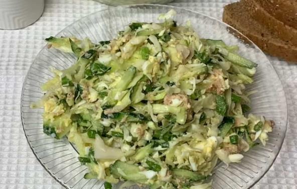 Skuvajte jaja, pa ih izrendajte. Kupus izrendajte, pa stavite u posudu i dodajte krastavac isečen na trake. Sve sastojke pomešajte, pa dodajte proceđenu tunjevinu, kao i seckani mladi luk. U posebnoj posudi pomešajte ulje, senf, sirće, so i biber, pa prelijte preko salate. Sjedinite i servirajte.
