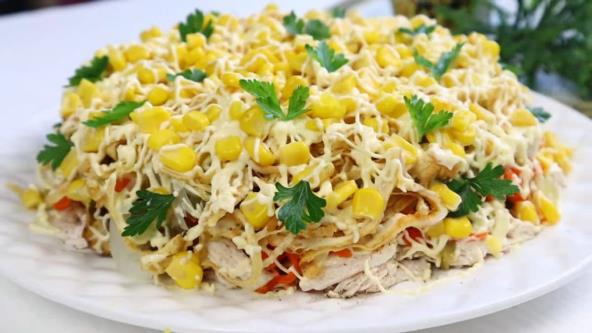 Luk isecite na rebarca, pa stavite u posudu, pošećerite, posolite, prelijte vodom i sirćetom. Ostavite da se marinira nekih 10 minuta. Belo meso skuvajte, pa sitno iseckajte i poređajte na dno posude. Jaja umutite i ispecite kao palačinku. Preko mesa premažite majonez, pa poređajte sitno iseckane pečurke koje ste prethodno propržili. Preko poređajte rendanu šargarepu, pa opet premažite majonezom, pa poređajte sitno seckani kiseli krastavac. Na kraju stavite marinirani luk preko, koji ste prethodno procedili. Pospite kajganom isečenom na trake, pa premažite majonezom. Pospite kukuruzom.