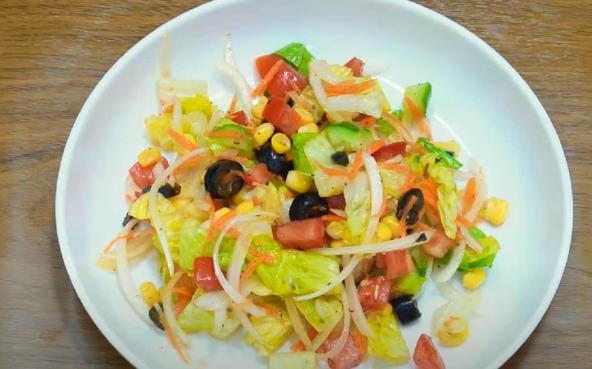 Iseckajte krastavac, paradajz i crni luk. Zelenu salatu operite i iseckajte. Šargarepu izrendajte na duža rezanca, a masline iseckajte na tanke kolutiće. Sve sastojke za salatu zajedno sa kukuruzom šećercem stavite u veću posudu jedne do drugih i prelijte ih isceđenim limunom. Dodajte so u salatu, biber, maslinovo ulje, pa sjedinite sve sastojke. Preporučujemo i obrok salatu sa toretelinama i povrćem.