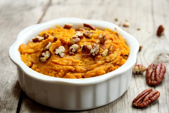 Dodajte puter u batat. Koristeći gnječilicu za krompir ili 2 viljuške, izgnječite krompir do željene konzistencije. Dodajte jaja, mleko, smeđi šećer, so, muskatni oraščić i vanilu i mešajte dok ne postane glatko. Prebacite u pripremljeno jelo.