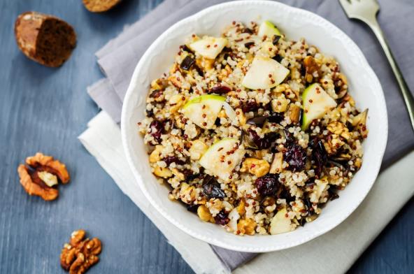Da biste napravili salatu od kelja sa jabukama i brusnicom, u srednjem loncu na jakoj vatri dovedite vodu do ključanja. Dodajte kinou i smanjite toplotu. Pokrijte i kuvajte dok se voda ne upije i kinoa ne omekša, oko 15 minuta. Sklonite sa vatre. Razmutite viljuškom, pa na vrh dodajte brusnice. Pokrijte i pustite da odstoji 5 minuta.