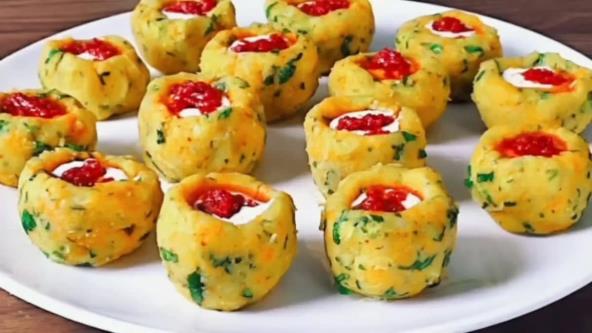 Uzmite malo pire krompira i oblikujte lopticu. Zatim palcem napravite rupu na sredini i malo oblikujte. Poređajte na tacnu, pa u svaku šupljinu sipajte dobijeni sos, a preko stavite malo kečapa ili paradajz paste.
