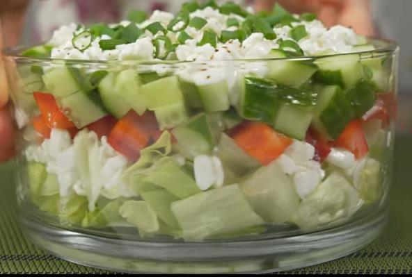 U posudu stavite zelenu salatu, začinite po želji, pa sipajte malo preliva i sitno sira. Zatim dodajte krastavac i papriku, pa opet sipajte preliv i sir. Pospite seckanim mladim lukom.