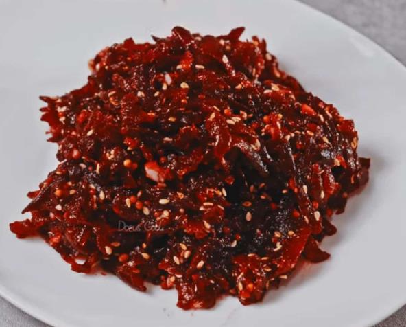 Skuvajte cveklu, pa kada se ohladi izrendajte je. Stavite u posudu, pa dodajte mleveni beli luk, so, biber, korijander, senf, ulje, sirće i dobro promešajte. Na kraju dodajte susam koji se kratko propržili.
