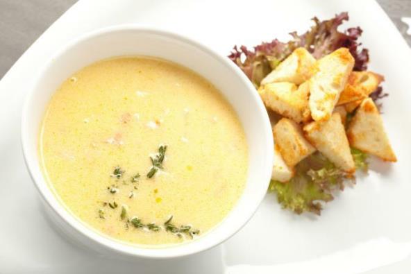 2. Ispasirati supu, dodati šafran, prokuvati i kuvati još 5 minuta. Doliti vino i slatku pavlaku, posoliti i pobiberiti. Iseckati tost hleb na trougliće i propržiti ga na preostalom puteru.