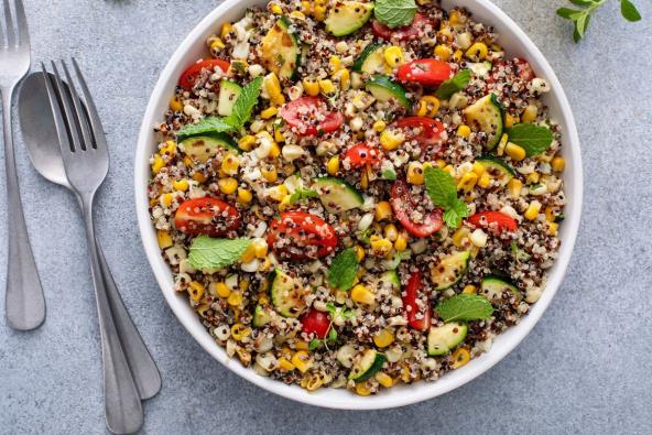 Kako biste napravlili salatu sa kinoom i povrćem, prvo skuvajte kukuruz i kinou. U velikoj činiji pomešajte kinou, paradajz, rukolu, krastavce, bosiljak i mentu, kuvani kukuruz, masline i luk.