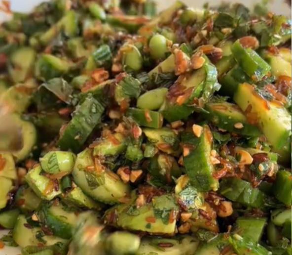 Iseckajte sve povrće i stavite ga u veliku činiju. Dodajte edamame i avokado isečen na kockice u činiju. Napravite preliv tako što ćete u maloj činiji da pomešate sastojke. Promešajte sve dok se dobro ne izmeša.