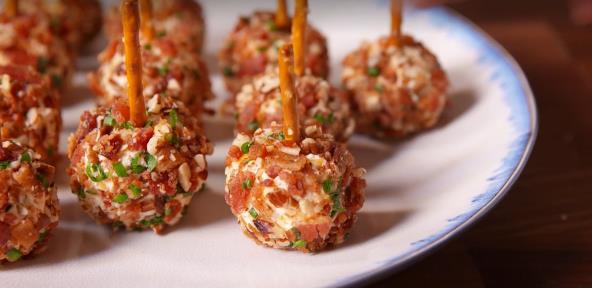 U plitkoj posudi pomešajte slaninu, kikiriki i vlašac. Uvaljajte kuglice u ovu mešavinu, pa u svaku ubacite slani štapić i ostavite da se zagreje na sobnoj temperaturi 15 minuta pre serviranja. Ako ne servirate odmah, ovlaš pokrijte najlonskom folijom i vratite u frižider. Možda ćete želeti da napravite i slane kuglice sa slaninom i krompirom po receptu profi kuvara.