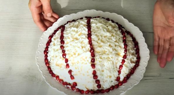 Preko cele salate ravnomerno rasporedite sloj rendanog sira i žumanaca i potpuno premažite majonezom. Odozgo pospite rendanim belancetom. Ukrasite bobicama nara. Stavite salatu u frižider na 1-2 sata da se dobro ohladi. Možda ćete želeti da napravite i slavsku salatu sa kukuruzom i piletinom.