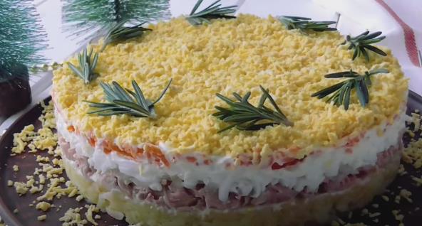 Po vrhu pospite rendanim žumancima. Pažljivo skinite kalup . Ukrasite po želji i ostavite u frižideru najmanje 2 sata. Uživajte! Možda ćete želeti da napravite i slavsku salatu sa kukuruzom i piletinom.