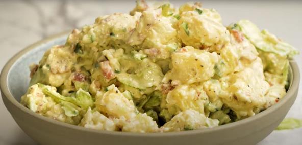 Napravite kremasti preliv. Pomešajte sastojke u činiji dok se ne sjedine. Pomešajte kremasti preliv, celer, krastavac, luk i većinu slanine. Servirajte ukrašeno preostalom slaninom. Možda ćete želeti da napravite i slaganu salatu sa krompirom, jajima i tunjevinom.