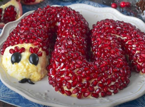 Od maslina napravite oči i jezik zmiji. Stavite salatu u frižider na 1 sat. Uživajte! Možda ćete želeti da napravite i salatu od krem sira, pršute i oraha za Novu godinu.