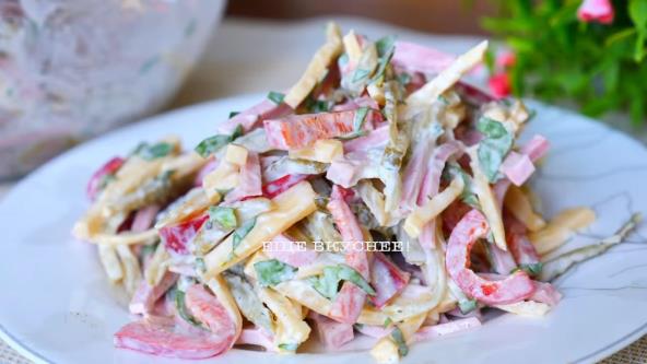Kisele krastavce, šunku, kačkavalj i papriku iseći na tanke trakice i staviti u činiju. Peršun iseckati sitno, pa dodati i njega. U manjoj čoiniji pomešati pavlaku, senf, limunov sok i beli luk. Dodati italijanski začin pa time preliti iseckanu salatu. Dobro promešati. Stavite u frižider pre služenja.