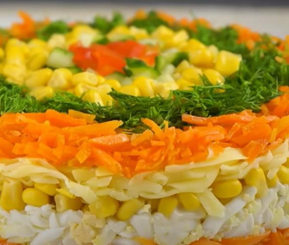 Preko toga pospite kiseli krastavac, pa preko njega malo majoneza, zatim šargarepu i još malo majoneza. Deo šargarepe ostavite za dekoraciju. Sledeći sloj su rendana jaja. Nanesite majonez preko njih. Zatim rasporedite kukuruz i nanesite sloj majoneza. Poslednji sloj je rendani kačkavalj premazan majonezom.
