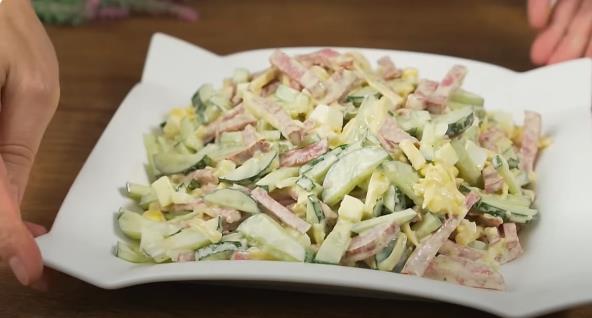 Za ovu salatu prvo isecite krastavac po dužini, pa na štapiće. Isecite kobasicu na kolutove, pa na štapiće. Jaja isecite na kockice, a sir narendajte na krupno rende. Pomešajte sve u činiji. Začinite po želji.