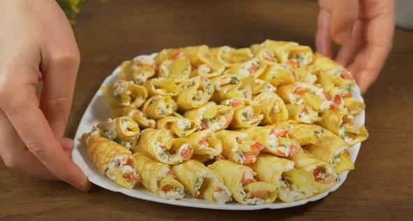 Dodajte 2-3 kašike majoneza i sve dobro izmešajte. Svaki omlet raširite i rasporedite fil po površini. Svaki omlet isecite na 8 jednakih trouglova i svaki trougao uvijte u rolnu. Servirajte i uživajte! Možda ćete želeti da napravite i španski omlet sa krompirom.
