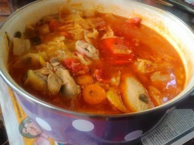 Iseći kupus na krupnije kocke, polovinu poredjati u šerpu, pa odozgo staviti krilca,papriku slatku i ljutu, šargarepu na kolutove, oljušten i isečen paradajz,,a zatim drugu polovinu kupusa. Naliti vodom da ogrezne pa staviti da se kuva na laganoj vatri 1 sat. Dodati kašiku začina. Napraviti zapršku na ulju u koga smo dodali brašno, koje kad porumeni dodati alevu papriku i preliti preko kupusa. Ako je potrebno dodati i malo soli. Pustiti da vri još 2-3 min i naš kupus je gotov.
