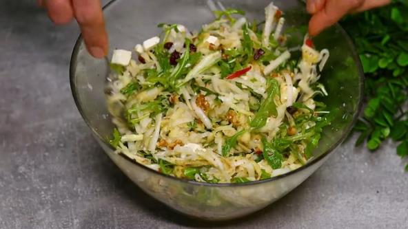 Kelerabu oljuštite i isecite na tanke štapiće ili kriške. Jabuku operite, isecite na četvrtine, uklonite jezgro i isecite na tanke kriške. Orahe grubo iseckajte. Fetu isecite na kockice ili izmrvite. Rukolu operite, osušite i po potrebi iseckajte na manje komade.