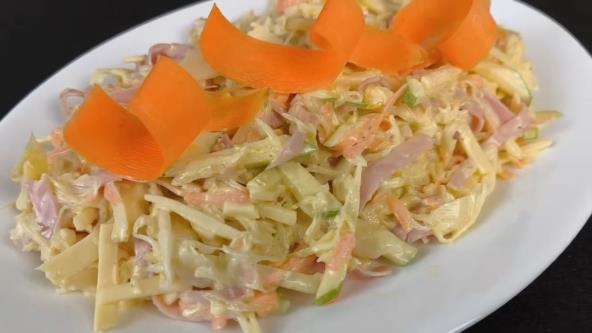 Kupus sitno iseckajte, šargarepu narendajte, a mladi luk isecite na kolutove. Šunku i sir iseckajte na trakice, pa ih dodajte u salatu. Jabuku oljuštite i iseckajte na kockice, dodajte u salatu za svežinu i slatkoću.