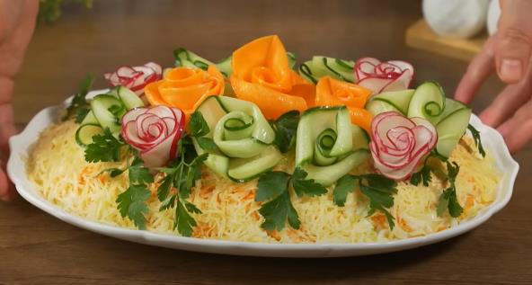 Ukrasite na kraju salatu. Izvadite trake šargarepe iz rastvora soli i osušite ih papirnim ubrusima. Traku šargarepe malo uvijte u cev. Zatim, uvijajući traku, formirajte laticu. Okrenite cvet i pričvrstite ga čačkalicama odozdo. Zatim napravite cvetove od rotkvica. Krugove rotkvice izvadite iz rastvora soli i osušimo papirnim ubrusom. Krugove poređajte jedan preko drugog u traku i urolajte ih u cvet, pa učvrstite čačkalicama.