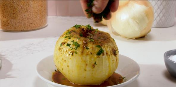 Stavite luk u aluminijumsku foliju. Pažljivo savijte foliju da zatvorite svaki luk i naborajte na vrhu. Ređajte ih na neobložen pleh. Pecite luk dok ne omekša u sredini, 55 do 65 minuta. Ostavite da se ohladi 2 minuta pre otvaranja. Premažite sačuvanim začinjenim puterom. Pospite peršunom i uživajte! Ovo može da bude odličan prilog uz meso. Možda ćete želeti da napravite i dimljeni luk punjen piletinom.