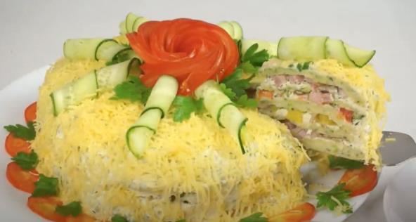 Isecite krastavac na tanke trake. Svaku traku krastavca uvijte u spiralu i stavite na tortu. Paradajz približno iste veličine isecite na pola i narežite na tanke kriške. Ukrasite dno torte isečenim paradajzom. Ukrasite i listićima peršuna. Držite u frižideru do serviranja. Uživajte! Možda ćete želeti da napravite i slanu tortu kakvu još niste probali.