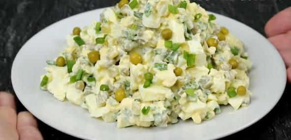 Skuvajte jaja, oljuštite ih i sitno iseckajte. U činiji pomešajte jaja, grašak, rendani sir, kiseli krastavac i zeleni luk. Dodajte majonez, so i biber, pa sve lagano promešajte da se sjedini. Ostavite u frižideru 15–20 minuta da se ukusi prožmu, pa poslužite.