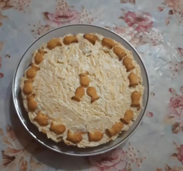 Konzervu tunjevine izgnječiti viljuškom, dodati majonez i dobro promešati. Luk iseckati na kockice, a šargarepu ispržiti na ulju dok ne omekša. Narendati sir i beli luk, dodati majonez i sve dobro promešati. U odgovarajuću posudu rasporediti salatu u slojevima: prvi sloj ribljih krekera, zatim sloj tunjevine, sledeći sloj krekera, pa sloj sira, belog luka i majoneza. Ponoviti slojeve dok ne iskoristite sve sastojke.