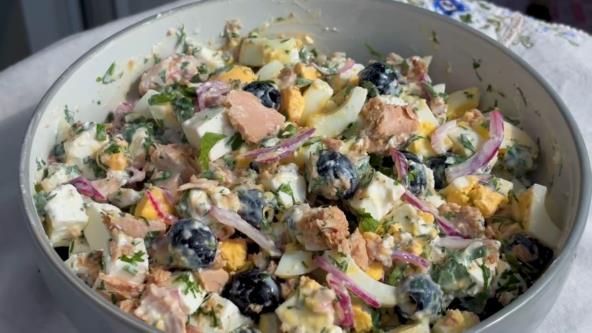U činiji sjediniti jogurt, limunov sok, mediteranske začine i biber. Dobro promešati. U većoj posudi lagano sjediniti tunjevinu, jaja, masline, luk i sir. Posuti iseckanim začinskim biljem. Preliti pripremljenim jogurt prelivom i nežno promešati.