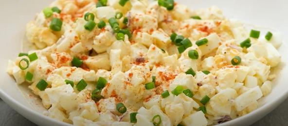 Kako biste napravili ovu salatu, prvo očistite i isecite jaja na kriške. Iseckajte crveni luk i vlašac. Pomešajte luk, jaja i majonez.