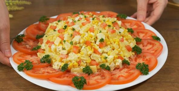 U velikoj činiji sjedinite sve sastojke: meso, jaja, sir, kukuruz i ananas. Dodajte seckani peršun, so i biber po ukusu. Pažljivo promešajte salatu. Na tanjir za serviranje poređajte po obodu kolutove paradajza, a u sredinu stavite ostatak salate. Ostavite je u frižideru da se rashladi pre služenja.