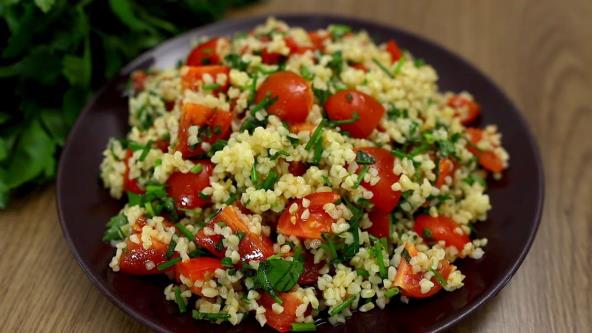 U međuvremenu, sitno naseckajte paradajz, peršun, zeleni luk i nanu. U većoj činiji pomešajte ohlađeni bulgur sa seckanim povrćem i začinskim biljem. Dodajte limunov sok, posolite, pobiberite i prelijte maslinovim uljem. Dobro promešajte.