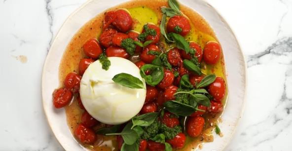 Ova salata je prava letnja raskoš – lagana, a opet bogatog ukusa, spaja kremastu buratu, pečeni paradajz, domaći pesto i mirisni bosiljak. Idealna je kao predjelo, ali uz dobar hleb može postati i glavno jelo kad želite nešto posebno, a jednostavno. Uz svaki zalogaj, otkriva se savršen balans toplog, hrskavog i nežnog.