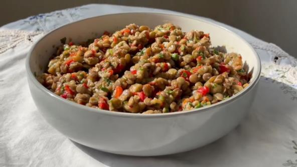 Pečeni patlidžan i paprike u kombinaciji sa zelenom sočivom i belim lukom stvaraju salatu punu ukusa i boja, idealnu i za toplo i za hladno posluživanje.