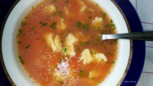 Vodu sipati u šerpu dodati kuvan paradajz ulje začin i malo soli. Pustiti da provri. U tanjir razmutiti jaje dodati brašno ulje i malo vode oko 2-3 kašike i razmutiti da se dobije gusta masa toliko da moše da otpada u čorbu . Masa mora biti glatka i nesme imati grudvica. Spuštati viljuškom dronjke u čorbicu i na kraju promešati kašikom ako su pali na dno. Pustiti da vri 5-6 minuta. Morate smanjiti temperatutru da Vam čorba ne pokipi. Na kraju dodati seckan peršun. Naša čorbica je gotova za veoma kratko vreme i spremna za serviranje.