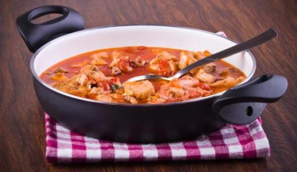 3. Dodajte na komade narezanu ribu, belo vino i sve lagano kuvajte četrdesetak minuta bez mešanja, povremeno protresajući. Posebno skuvajte široke rezance i uz topli paprikaš.